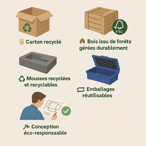 - Systèmes de fermeture et de manutention adaptés : poignées, charnières, serrures, marquages de sécurité, sangles, ou calages amovibles pour les emballages de réutilisation.